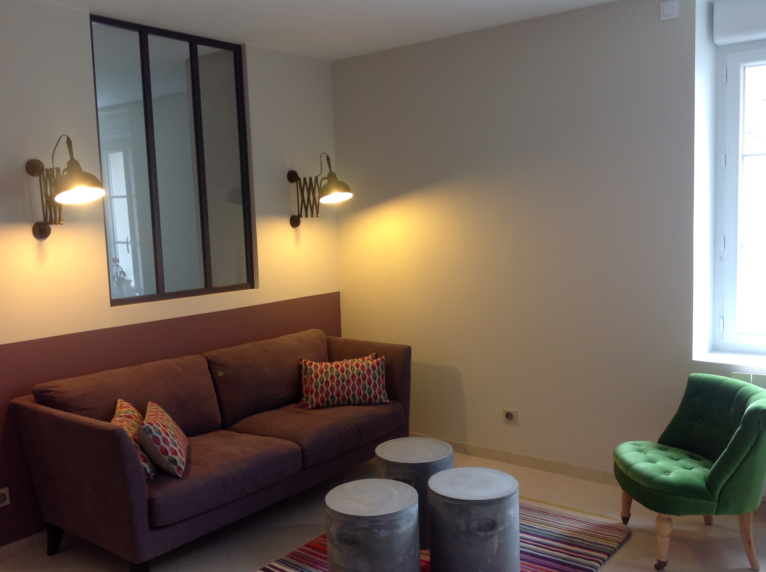 Mise en place de cloisons phoniques avec porte coulissante, verrière d'atelier, jeu des couleurs, des éclairages.